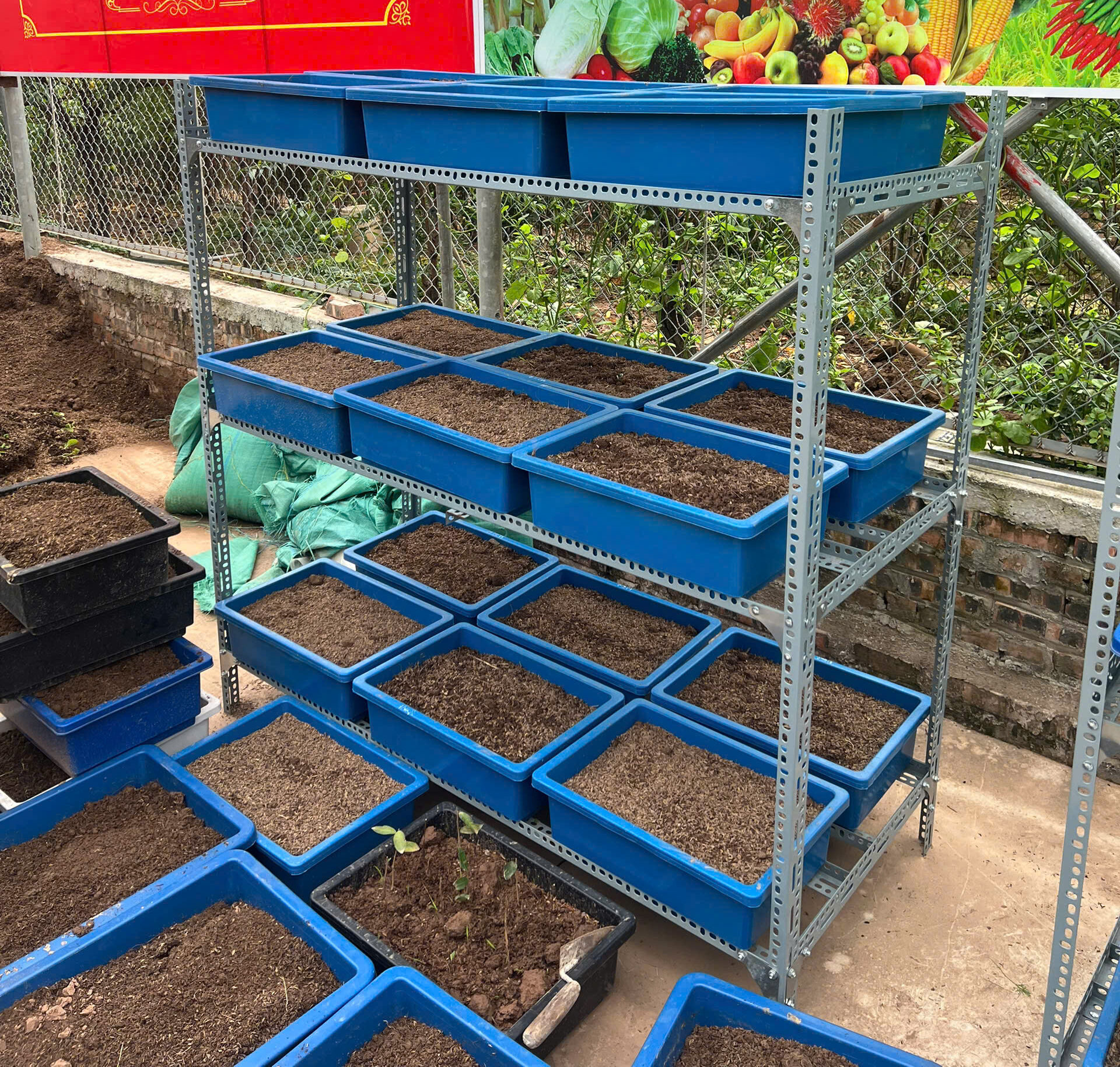 - Rau được trồng váo các khay với kích thước 30cmx50cm, khay sẽ được đặt trên kệ có 3 tầng và mỗi tầng có 6 khay rau